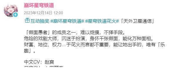要知说念,花火在演出垃圾桶、小怪之前,演出的然则匹诺康尼的知名偶像“知更鸟”。她的歌曲《使一颗心免于哀伤》好吃舌常火的。